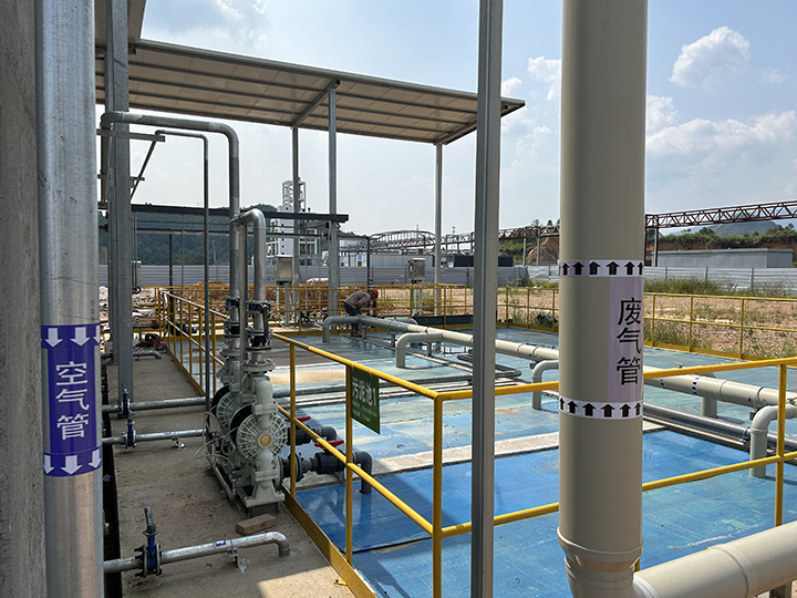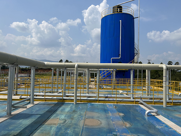 采用前處理 +IC厭氧塔+好氧+MBR工藝 COD進水60000mg/l,出水COD<200mg/l,氨氮進水800mg/l,出水40mg/l,達到管網(wǎng)排放標準